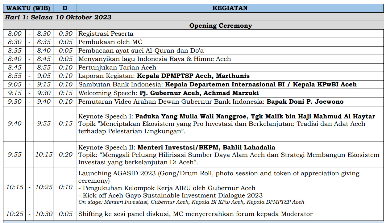 Acara Aceh Sustainable Investment Dialogue terdiri dari acara pembukaan yang dihadiri oleh Menteri Investasi, Bahlil Lahadalia, Penjabat Gubernur Aceh Achmad Marzuki, Wali Nanggroe PYM Malik Mahmud, Ketua Umum JAPNAS, Bayu Priawan Djokosoetono serta perwakilan negara asing, pihak swasta, LSM dan pemerintah daerah.