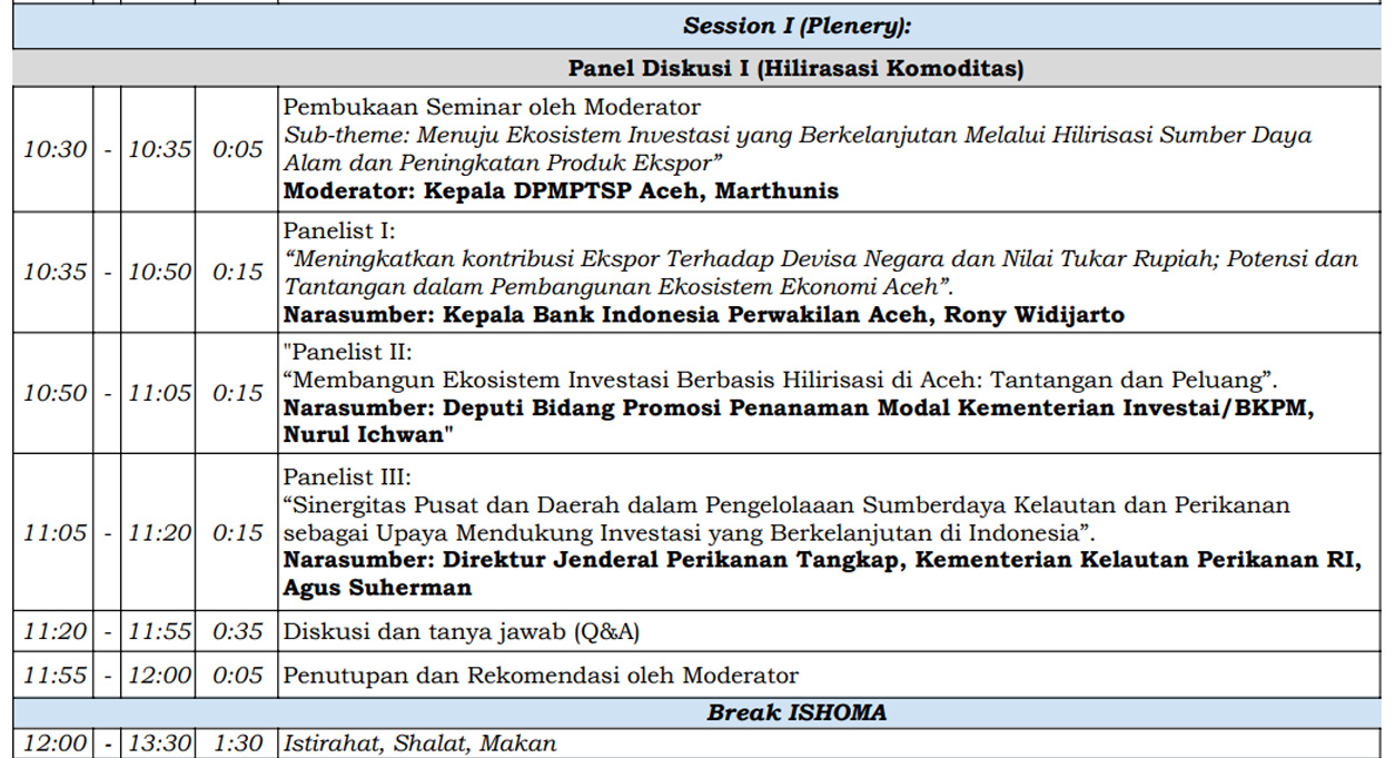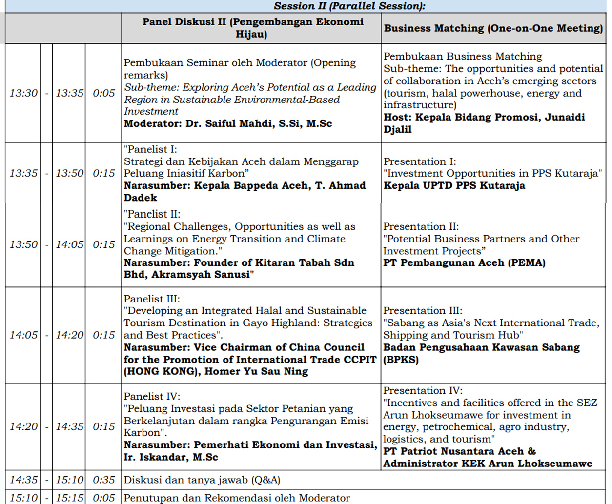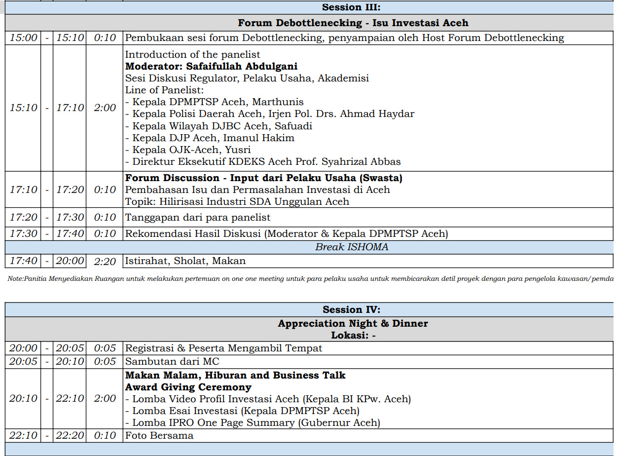 Merupakan kegiatan yang digagas oleh Dinas Penanaman Modal dan Pelayanan Terpadu Satu Pintu (DPMPTSP) Aceh bekerja sama dengan Regional Investor Relations Unit (RIRU)-Kantor Perwakilan Bank Indonesia Provinsi Aceh, yang dirancang untuk memberikan kesempatan kepada seluruh pihak, baik dalam maupun luar negeri, untuk berpartisipasi dalam pembahasan agenda pembangunan dan investasi yang berkelanjutan dan berwawasan kepada pelestarian lingkungan, berdampak sosial dan tata kelola pemerintahan yang baik (good governance) atau ESG (Environmental, social, and governance).