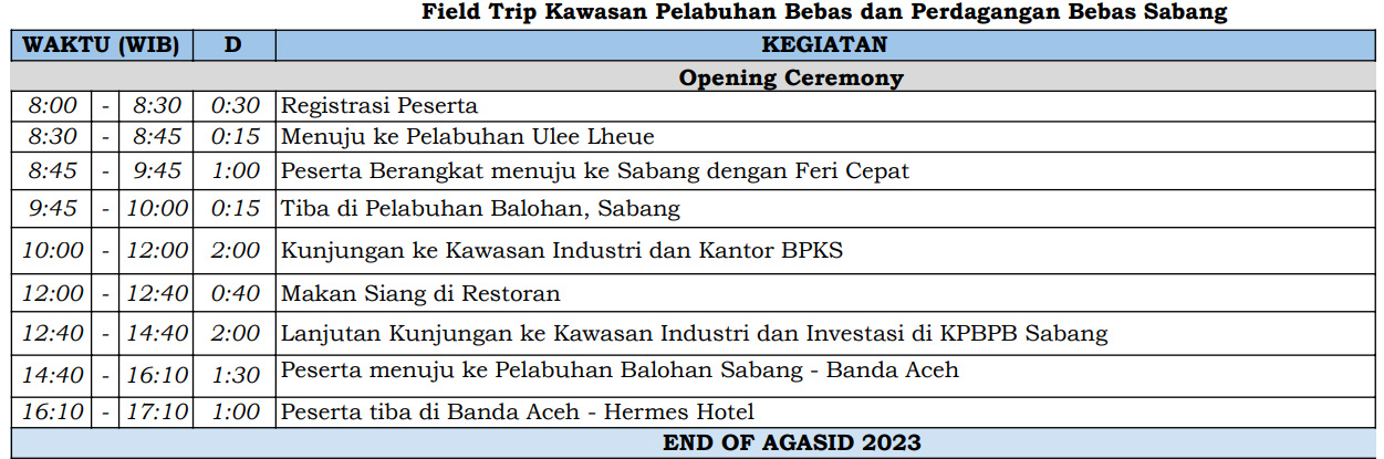Acara ini memberikan kesempatan para peserta untuk mengunjungi lokasi pusat perhatian investasi yang tersebar di Aceh seperti di KPBPB Sabang.